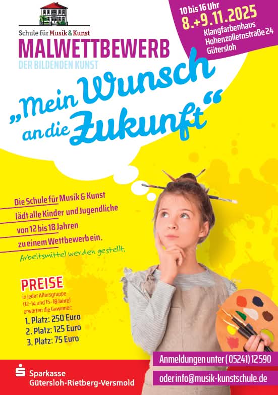 Die Schule für Musik & Kunst veranstaltet 08. + 09.11., Sa. + So., im Gebäude Hohenzollernstr. 24 einen Malwettbewerb unter dem Motto "Mein Wunsch an die Zukunft".